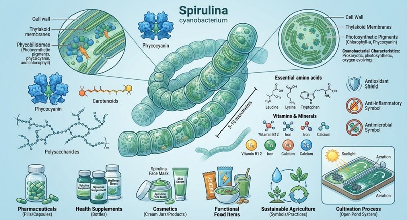 Abstract: Spirulina is a very helpful cyanobacterium that is rich in protein, essential amino acids, vitamins, minerals, and biologically active components like phycocyanin, carotenoids, and polysaccharides. Its strong antioxidant, anti-inflammatory, antimicrobial, antiviral, antidiabetic, and anticancer qualities are supported by these components, making it beneficial for use in pharmaceuticals and health supplements. Spirulina can be used in the pharmaceutical, cosmetic, functional food, and sustainable development industries due to its ease of cultivation and sustainability. Even though they are usually safe, quality control is essential to preventing contamination from toxins or heavy metals. All things considered, spirulina is a versatile microalga with significant therapeutic and nutritional advantages.